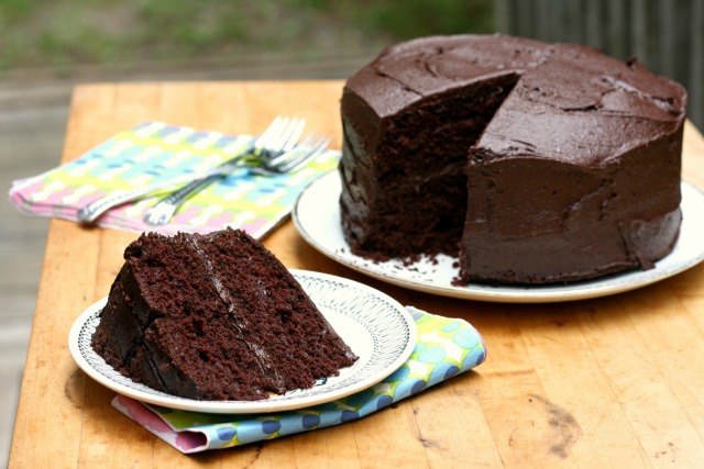 Chocolate layer cake is quick to mix up, is moist and the frosting is especially frothy and delicious. The cake cuts like a dream.